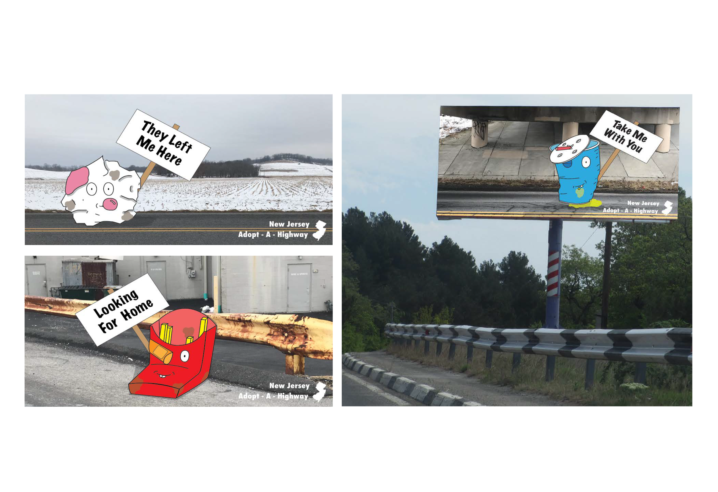 This student project aimed to create a billboard campaign for the non profit group Adopt a Highway to bring awareness to littering. Original characters were illustrated and photoshopped into roadside scenes.